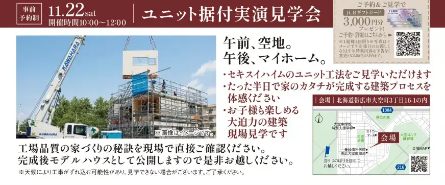 - 2025年11月22日(土)10:00~12:00(天候により、工事がずれ込む可能性がございます。ご見学できない場合もございますのでご了承ください。)
